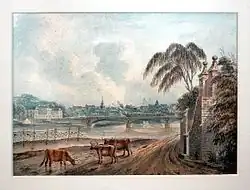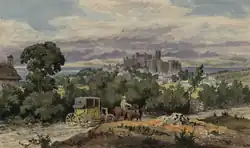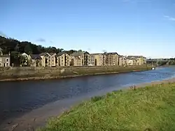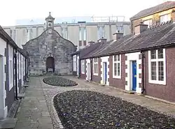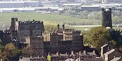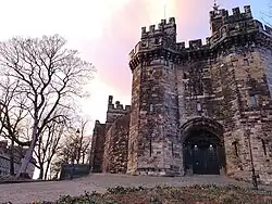Lancaster Castle, partly built in the 13th century and enlarged by Elizabeth I, stands on the site of a Roman garrison. During The Great Raid of 1322, damage was done to the castle by Robert the Bruce, though it resisted the attack and was restored and strengthened by John of Gaunt, 1st Duke of Lancaster, who added much of the Gateway Tower and a turret on the keep or Lungess Tower, which has been named "John o' Gaunt's Chair".[22] In 1322 the Scots burnt the town. It was rebuilt but removed from its position on the hill to the slope and foot. Again in 1389, after the Battle of Otterburn, it was destroyed by the Scots.[22] Lancaster Castle is known as the site of the Pendle witch trials in 1612. It was said that the court based in the castle (the Lancaster Assizes) sentenced more people to be hanged than any other in the country outside London, earning Lancaster the nickname, "the Hanging Town".[23] It also figured prominently in the suppression of Catholicism during the Reformation – at least eleven Catholic priests were executed and a memorial to them as the Lancaster Martyrs stands by the city centre.