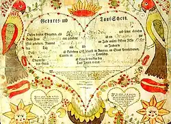 - Fraktur, the artistic and elaborate 18th- century and 19th-century hand-illustrated folk art inspired by German blackface type, originated at Johann Conrad Beissel's cloister of German Seventh Day Baptists in Ephrata.[44]