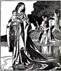 Lancelot may have been the hero of a popular folk tale that was originally independent but was ultimately absorbed into the Arthurian tradition. The theft of an infant by a water fairy, the appearance of the hero at a tournament on three consecutive days in three different disguises, and the rescue of a queen or princess from an Otherworld prison are all features of a well-known and widespread tale, variants of which are found in numerous examples collected by Theodore Hersart de la Villemarqué in his Barzaz Breiz, by Emmanuel Cosquin in his Contes Lorrains, and by John Francis Campbell in his Tales of the West Highlands.[13] As for his name, Lancelot may be a variant of the French name Lancelin (the word likely meaning javelin in Old French[14]) as proposed by Gaston Paris in 1881, later supported by Rachel Bromwich.[15] It is also possibly derived from the Old French word L'Ancelot, meaning "Servant" (the hypothesis first put forward by de la Villemarqué in 1842); Lancelot's name is actually written this way in several manuscripts.[9] It is furthermore reminiscent of an uncommon Saxon name Wlanc, meaning "The Proud One".[16]