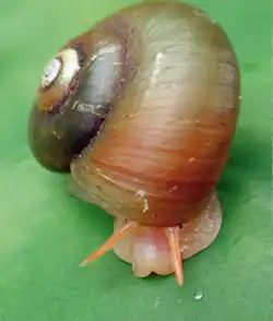 Land snails are a polyphyletic group comprising at least ten independent evolutionary transitions to terrestrial life (the last common ancestor of all gastropods was marine).[1][2][3][4][5] The majority of land snails are pulmonates that have a lung and breathe air. Most of the non-pulmonate land snails belong to lineages in the Caenogastropoda, and tend to have a gill and an operculum. The largest clade of non-pulmonate land snails is the Cyclophoroidea, with more than 7,000 species.[6] Many of these operculate land snails live in habitats or microhabitats that are sometimes (or often) damp or wet, such as in moss.