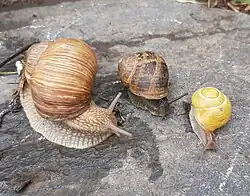 From left to right: Roman snail (Helix pomatia), Garden snail (Cornu aspersum) and White-lipped snail (Cepaea hortensis), three species of Helicinae.