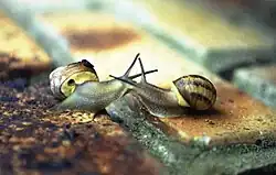 Land snails move by gliding along on their muscular foot, which is lubricated with mucus and covered with epithelial cilia.[9] This motion is powered by succeeding waves of muscular contractions that move down the ventral of the foot. This muscular action is clearly visible when a snail is crawling on the glass of a window or aquarium.[10] Snails move at a proverbially low speed (1 mm/s is a typical speed for adult Helix lucorum[11]). Snails secrete mucus externally to keep their soft bodies from drying out. They also secrete mucus from the foot to aid in locomotion by reducing friction, and to help reduce the risk of mechanical injury from sharp objects, meaning they can crawl over a sharp edge like a straight razor and not be injured.[12] The mucus that land snails secrete with the foot leaves a slime trail behind them, which is often visible for some hours afterwards as a shiny "path" on the surface over which they have crawled.