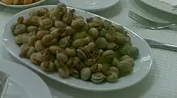 In Greece, snails are popular in the island of Crete, but are also eaten in many parts of the country and can even be found in supermarkets, sometimes placed alive near partly refrigerated vegetables. In this regard, snails are one of the few live organisms sold at supermarkets as food. They are eaten either boiled with vinegar added, or sometimes cooked alive in a casserole with tomato, potatoes and squashes. Limpets and sea snails also find their way to the Greek table around the country. Another snail cooking method is the Kohli Bourbouristi (κοχλιοί μπου(ρ)μπουριστοί),[47] a traditional Cretan dish, which consists of fried snails in olive oil with salt, vinegar and rosemary.