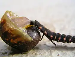 The larva of a glowworm (Lampyris noctiluca) attacking and eating a land snail