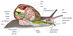 Land snails have a strong muscular foot; they use mucus to enable them to crawl over rough surfaces and to keep their soft bodies from drying out. Like other mollusks, land snails have a mantle, and they have one or two pairs of tentacles on their head. Their internal anatomy includes a radula and a primitive brain. In terms of reproduction, many caenogastropod land snails (e.g., diplommatinids) are dioecious,[7][8] but pulmonate land snails are hermaphrodites (they have a full set of organs of both sexes) and most lay clutches of eggs in the soil. Tiny snails hatch out of the egg with a small shell in place, and the shell grows spirally as the soft parts gradually increase in size. Most land snails have shells that are right-handed in their coiling.