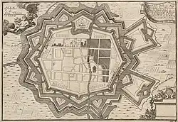 After the Peace of Westphalia in 1648, control of Landau was ceded to France, although with certain ill-defined reservations.[4] Landau was later part of France from 1680 to 1815,[5] during which it was one of the Décapole, the ten free cities of Alsace, and received its modern fortifications by Louis XIV's military architect Vauban in 1688–99, making the little town (its 1789 population was approximately 5,000) one of Europe's strongest citadels. In the War of the Spanish Succession it had four sieges. After the siege of 1702 lost by the French, an Imperial garrison was installed in Landau. In a subsequent siege from 13 October to 15 November 1703 the French regained the town, following their victory in the Battle of Speyerbach.[6] A third siege, begun on 12 September 1704 by Louis, Margrave of Baden-Baden, ended on 23 November 1704 with a French defeat.[7] During this siege King Joseph I arrived at Landau coming from Vienna in a newly developed convertible carriage. This carriage would become very popular and became named the landau in English, or Landauer in German. The French recaptured Landau once more in a final siege which lasted from 6 June to 20 August 1713 by Marshal General Villars.[8]