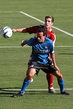 Later in 1999, Donovan signed a six-year contract for German Bundesliga club Bayer Leverkusen, whose sporting director Michael Reschke spotted him at a youth tournament in Europe.[21] Despite becoming a regular starter for the club's reserve team upon arrival, Donovan had trouble adapting to life overseas and was allowed extended training periods with United States youth national teams.[22] He played in a German Cup match for the reserve team.[23] Unhappy with his situation with Leverkusen, Donovan was loaned to the San Jose Earthquakes of Major League Soccer (MLS) for the 2001 season. In MLS, Donovan had immediate success, leading the Earthquakes to MLS Cup championships in 2001 and 2003 and becoming one of the only recognizable faces of soccer in the United States.[24] In four years in the league, he scored 32 goals[25] and 29 assists in league play, and ten goals and six assists in the playoffs.[25] Two of those goals were in the 2003 MLS Cup, a 4–2 Earthquakes triumph over Chicago Fire SC. Donovan earned Man of the Match for his actions. He was named U.S. Soccer Athlete of the Year in 2003.[26]