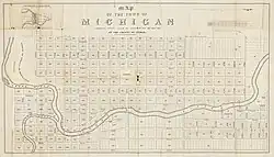 An 1847 plat map of "the town of Michigan", prior to the selection of "Lansing" as the capital's name the following year. (The map is oriented with north to the right.)