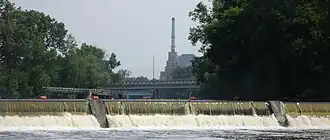 The North Lansing dam of the Grand River. The Lansing River Trail and Ottawa Street Power Station are visible behind.
