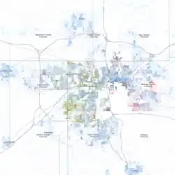 Map of racial distribution in Lansing, 2020 U.S. census. Each dot is one person: ⬤ White⬤ Black⬤ Asian⬤ Hispanic⬤ Multiracial⬤ Native American/Other