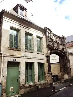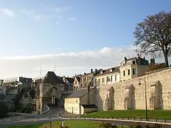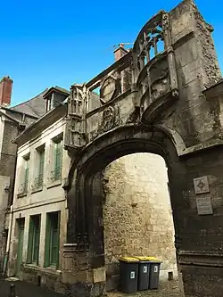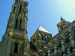 The city contains numerous medieval buildings, including the cathedral Notre-Dame of Laon, dating mostly from the 12th and 13th centuries. The chapter-house and the cloister contain specimens of early 13th-century architecture. The old episcopal palace, contiguous to the cathedral, is now used as a court-house. The front, flanked by turrets, is pierced by large pointed windows. There is also a Gothic cloister and an old chapel of two storeys, of a date earlier than the cathedral.[5]