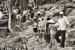 After the communist takeover in Laos, up to 300,000 people fled to neighbouring Thailand,[13] and Hmong rebels began an insurgency against the new government. The Hmong were persecuted as traitors and "lackeys" of the Americans, with the government and its Vietnamese allies carrying out human rights abuses against Hmong civilians. The incipient conflict between Vietnam and China also played a role with Hmong rebels being accused of receiving support from China. Over 40,000 people died in the conflict.[14] The Lao royal family were arrested by the Pathet Lao and sent to labor camps, where most of them died in the late 1970s and 1980s, including King Savang Vatthana, Queen Khamphoui and Crown Prince Vong Savang.[15]