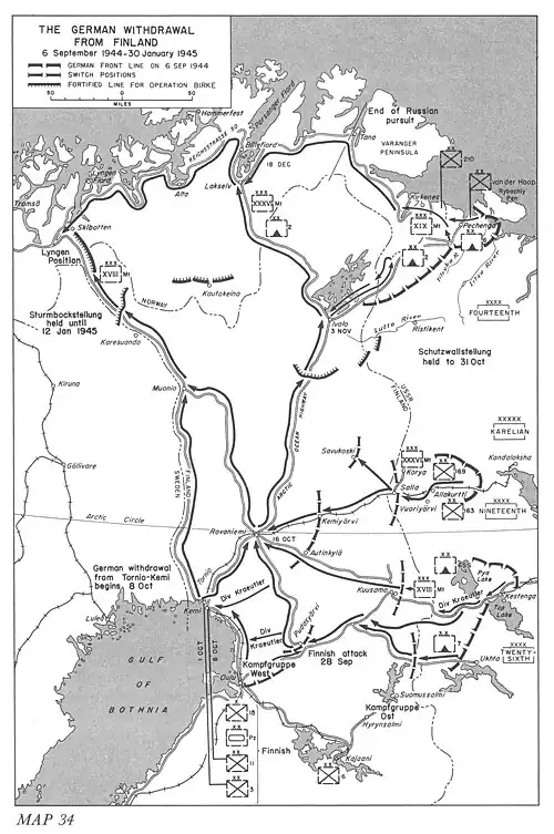 When Allied advances continued, German high command OKW and 20th Mountain Army leadership asserted that it would be perilous to maintain positions in Lapland and east of Lyngen Municipality in northern Norway. Likewise, Minister of Armaments and War Production Albert Speer had determined that German nickel stores were sufficient and holding Petsamo was unnecessary. Preparations for further withdrawal began. Hitler accepted the proposal on 4 October 1944, and the plan was codenamed Operation Nordlicht on 6 October.[53] Instead of a gradual withdrawal from southern Lapland into fortified positions further to the north while evacuating materiel, as in Operation Birke, Operation Nordlicht called for a rapid and strictly organised withdrawal directly behind Lyngen Fjord in Norway, while under pressure from harassing enemy forces.[53] As the Germans withdrew towards the town of Rovaniemi, a road junction point in Lapland, and Norway, movement was mostly limited to the immediate vicinity of Lapland's three main roads, which constricted military activities considerably. In general, the withdrawal followed a pattern in which advancing Finnish units would encounter German rear guards and attempt to flank them on foot, but the destroyed road network prevented them from bringing up artillery and other heavy weapons. As Finnish infantry slowly picked their way through the dense woods and marshland, the motorised German units would simply drive away and take up positions further down the road.[54]