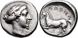 When Larissa ceased minting the federal coins it shared with other Thessalian towns and adopted its coinage in the late fifth century BC, it chose local types for its coins. The obverse depicted the nymph of the local spring, Larissa, for whom the town was named; probably the choice was inspired by the famous coins of Kimon depicting the Syracusan nymph Arethusa. The reverse depicted a horse in various poses. The horse was an appropriate symbol of Thessaly, a land of plains, which was well known for its horses. Usually, there is a male figure; he should perhaps be seen as the eponymous hero of the Thessalians, Thessalos, who is probably also to be identified on many of the earlier, federal coins of Thessaly.