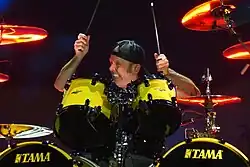 Ulrich endorses Tama drums and hardware.[32] He plays a Starclassic Maple series drum kit, with 10" and 12" rack toms, two 16" floor toms and two 22" bass drums.[33] From 2008 to 2016 he used the kit in orange,[34] and the WorldWired Tour featured the similar kit with a Deeper Purple finish.[35][33] During the M72 World Tour, the kit is bright yellow with black hardware.[36] With Tama, Ulrich has designed his signature 14×6.5" steel snare drum, model LU1465.[37] Ulrich also endorses Zildjian cymbals,[38][39] Remo drumheads,[40] and Ahead drumsticks.[41]