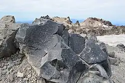 The only active Cascade volcano with an elevation above 10,000 ft (3,000 m) that is not a stratovolcano,[8] Lassen Peak is a rhyodacitic lava dome.[44] It represents one of the largest lava domes on Earth, with a height of 2,000 ft (610 m) above its surroundings,[43] and an approximate volume of 0.60 cu mi (2.5 km3).[45] Unlike more conventional, conical stratovolcanoes like Mount Shasta or Mount Rainier, Lassen Peak is part of a volcanic center that erupts from different vents, which each remain active for a number of years or decades but often do not erupt from the same vent twice, also known as a monogenetic volcanic field.[46] 2000 years after Lassen's formation, it was surrounded by glaciers which ate away at its spiny protrusions of dacite.[47] Due to glacial erosion from the last local glacial advance, which ceased roughly 15,000 years ago, Lassen's lava dome is now covered in broken rock fragments at the base of crags called talus deposits. Only its crag formations on its southern flank, near the summit trailhead, have not been significantly altered by glacial erosion.[48]