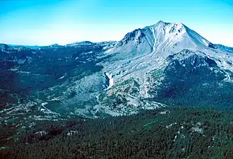 Lassen Peak lies within Lassen Volcanic National Park, in Shasta County, California, 55 mi (89 km) east of the city of Redding.[4] Lassen Peak and the rest of the National Park area are surrounded by the Lassen National Forest,[5] which has an area of 1,200,000 acres (4,900 km2).[6] Nearby towns include Mineral in Tehama County and Viola in Shasta County.[4]
