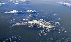 Lassen Peak has the highest known winter snowfall amounts in California, with an average annual snowfall of 660 in (1,676 cm); in some years, more than 1,000 in (2,500 cm) of snow falls at its base elevation of 8,250 ft (2,515 m) at Lake Helen. The Lassen Peak area receives more precipitation (rain, sleet, hail, snow, etc.) than anywhere in the Cascade Range south of the Three Sisters volcanoes in Oregon.[12] Though the volcano lies too far to the south to support a permanent snow cover over the entire mountain,[8] the heavy annual snowfall on Lassen Peak creates fourteen permanent patches of snow on and around the mountain top, but no glaciers.[13]
