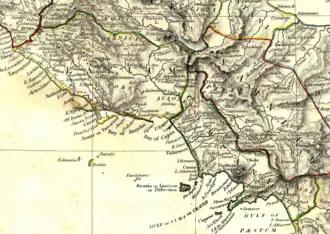 Latium was originally a small triangle of fertile, volcanic soil (Old Latium) on which resided the tribe of the Latins or Latians.[5] It was located on the left bank (east and south) of the River Tiber, extending northward to the River Anio (a left-bank tributary of the Tiber) and southeastward to the Pomptina Palus (Pontine Marshes, now the Pontine Fields) as far south as the Circeian promontory.[6] The right bank of the Tiber was occupied by the Etruscan city of Veii, and the other borders were occupied by Italic tribes. Subsequently, Rome defeated Veii and then its Italic neighbours, expanding its dominions over Southern Etruria and to the south, in a partly marshy and partly mountainous region. The latter saw the creation of numerous Roman and Latin colonies: small Roman colonies were created along the coast, while the inland areas were colonized by Latins and Romans without citizenship. The name Latium was thus also extended to this area south of Rome (Latium adiectum), up to the ancient Oscan city of Casinum, defined by Strabo as "the last city of the Latins".[7]
