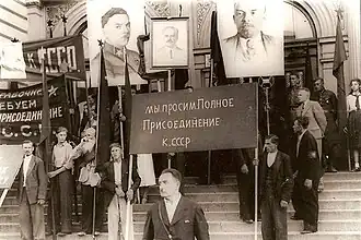 Up to the reassessment of Soviet history in the USSR that began during Perestroika, before the USSR had condemned the 1939 secret protocol between Nazi Germany and itself that had led to the invasion and occupation of the three Baltic countries,[50] the events in 1939 were as follows: The Government of the Soviet Union suggested that the Governments of the Baltic countries conclude mutual assistance treaties between the countries. Pressure from working people forced the governments of the Baltic countries to accept this suggestion. The Pacts of Mutual Assistance were then signed[51] which allowed the USSR to station a limited number of Red Army units in the Baltic countries. Economic difficulties and dissatisfaction of the populace with the Baltic governments' policies that had sabotaged the fulfillment of the Pact and the Baltic countries' governments' political orientation toward Nazi Germany led to a revolutionary situation in June 1940. To guarantee the Pact's fulfillment, additional military units entered Baltic countries, welcomed by the workers who demanded the resignations of the Baltic governments. In June, under the leadership of the Communist Parties, political demonstrations by workers were held. The fascist governments were overthrown, and workers' governments were formed. In July 1940, elections for the Baltic Parliaments were held. The "Working People's Unions," created by an initiative of the Communist Parties, received the majority of the votes.[52] The Parliaments adopted the declarations of the restoration of Soviet powers in Baltic countries and proclaimed the Soviet Socialist Republics. Declaration of Estonia's, Latvia's and Lithuania's wishes to join the USSR were adopted, and the Supreme Soviet of the USSR petitioned accordingly. The Supreme Soviet of the USSR approved the requests.