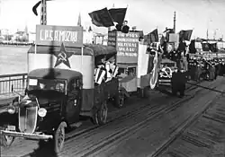 Ulmanis' government resigned and was replaced by a left-wing government created under instructions from the USSR embassy. Until the election of the People's Parliament on the 14/15 July 1940, there were no public statements about governmental plans to introduce a Soviet political order or to join the Soviet Union. Soon after the occupation, the Communist Party of Latvia became the only legal party and presented the "Latvian Working People's Bloc" for the elections.[15][16] It was the only permitted participant in the election after an attempt by other politicians to include the Democratic Bloc (an alliance of all banned Latvian parties, except the Social Democratic Workers' Party) on the ballot was prevented by the government. Its office was closed, election leaflets confiscated, and its leaders arrested.[17]