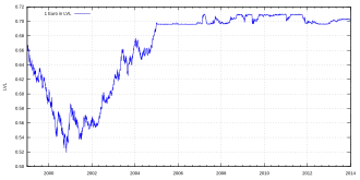 The lats was reintroduced on 5 March 1993,[19] replacing the Latvian ruble, which continued to circulate and kept validity until and including 30 June 1994[20] at a rate of LR 200 being equivalent to Ls 1. The Ls 5 banknote was introduced first, and the last banknote to be introduced was the Ls 500 banknote on 20 July 1998.[21] The lats was replaced on 1 January 2014 by the euro, at the rate of Ls 0.702804 to €1. The second lats can be exchanged to euros at the official rate at the Bank of Latvia's cashier's office in Riga.[22]