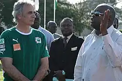 Six of Gbagbo's former allies also returned after spending years in exile after being encouraged by the current president Ouattara.[80][81] In October 2021, Gbagbo launched a new political party called the African People's Party – Cote d'Ivoire (PPA-CI).[82] In December 2021, he spent four days in Ghana. According to a statement from his party, he went there to attend the funeral of Captain Kojo Tsikata, a man close to the former president of Ghana Jerry Rawlings. Laurent Gbagbo also visited the Ivorian exiles, whose return he wanted to the country since the Ivorian crisis, 11,000 Ivorians fled the post-election crisis to seek asylum in neighboring Ghana.[83][84]