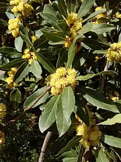 The bay laurel is dioecious (unisexual), with male and female flowers on separate plants.[9] Each flower is pale yellow-green, about 1 cm (3⁄8 in) diameter, and they are borne in pairs beside a leaf. The leaves are glabrous, 6–12 cm (2–5 in) long and 2–4 cm (3⁄4–1+5⁄8 in) broad, with an entire (untoothed) margin. On some leaves the margin undulates.[9] The fruit is a small, shiny black drupe-like berry[10][11] about 1 cm (3⁄8 in) long[9] that contains one seed.[12][5]