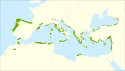 Laurus nobilis is a widespread relict of the laurel forests that originally covered much of the Mediterranean Basin when the climate of the region was more humid. With the drying of the Mediterranean during the Pliocene era, the laurel forests gradually retreated, and were replaced by the more drought-tolerant sclerophyll plant communities familiar today. Most of the last remaining laurel forests around the Mediterranean are believed to have disappeared approximately ten thousand years ago, although some remnants still persist in the mountains of southern Turkey, northern Syria, southern Spain, north-central Portugal, northern Morocco, the Canary Islands and in Madeira.
