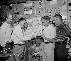 The first important work on element 103 was done at Berkeley by the nuclear-physics team of Albert Ghiorso, Torbjørn Sikkeland, Almon Larsh, Robert M. Latimer, and their co-workers on February 14, 1961.[54] The first atoms of lawrencium were reportedly made by bombarding a three-milligram target consisting of three isotopes of californium with boron-10 and boron-11 nuclei from the Heavy Ion Linear Accelerator (HILAC).[55] The Berkeley team reported that the isotope 257103 was detected in this manner, and that it decayed by emitting an 8.6 MeV alpha particle with a half-life of 8±2 s.[53] This identification was later corrected to 258103,[55] as later work proved that 257Lr did not have the properties detected, but 258Lr did.[53] This was considered at the time to be convincing proof of synthesis of element 103: while the mass assignment was less certain and proved to be mistaken, it did not affect the arguments in favor of element 103 having been synthesized. Scientists at Joint Institute for Nuclear Research in Dubna (then in the Soviet Union) raised several criticisms: all but one were answered adequately. The exception was that 252Cf was the most common isotope in the target, and in the reactions with 10B, 258Lr could only have been produced by emitting four neutrons, and emitting three neutrons was expected to be much less likely than emitting four or five. This would lead to a narrow yield curve, not the broad one reported by the Berkeley team. A possible explanation was that there was a low number of events attributed to element 103.[53] This was an important intermediate step to the unquestioned discovery of element 103, although the evidence was not completely convincing.[53] The Berkeley team proposed the name "lawrencium" with symbol "Lw", after Ernest Lawrence, inventor of the cyclotron. The IUPAC Commission on Nomenclature of Inorganic Chemistry accepted the name, but changed the symbol to "Lr".[56] This acceptance of the discovery was later characterized as being hasty by the Dubna team.[53]