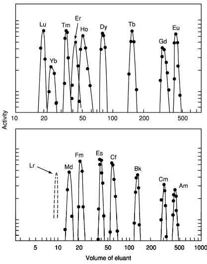 Studies on the element, performed in 1969, showed that lawrencium reacts with chlorine to form a product that was most likely the trichloride, LrCl3. Its volatility was found to be similar to the chlorides of curium, fermium, and nobelium and much less than that of rutherfordium chloride. In 1970, chemical studies were performed on 1500 atoms of 256Lr, comparing it with divalent (No, Ba, Ra), trivalent (Fm, Cf, Cm, Am, Ac), and tetravalent (Th, Pu) elements. It was found that lawrencium coextracted with the trivalent ions, but the short half-life of 256Lr precluded a confirmation that it eluted ahead of Md3+ in the elution sequence.[71] Lawrencium occurs as the trivalent Lr3+ ion in aqueous solution and hence its compounds should be similar to those of the other trivalent actinides: for example, lawrencium(III) fluoride (LrF3) and hydroxide (Lr(OH)3) should both be insoluble in water.[71] Due to the actinide contraction, the ionic radius of Lr3+ should be smaller than that of Md3+, and it should elute ahead of Md3+ when ammonium α-hydroxyisobutyrate (ammonium α-HIB) is used as an eluant.[71] Later 1987 experiments on the longer-lived isotope 260Lr confirmed lawrencium's trivalency and that it eluted in roughly the same place as erbium, and found that lawrencium's ionic radius was 88.6±0.3 pm, larger than would be expected from simple extrapolation from periodic trends.[71] Later 1988 experiments with more lawrencium atoms refined this to 88.1±0.1 pm and calculated an enthalpy of hydration value of −3685±13 kJ/mol.[71] It was also found that the actinide contraction at the end of the actinides was larger than the analogous lanthanide contraction, with the exception of the last actinide, lawrencium: the cause was speculated to be relativistic effects.[71]