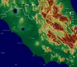 In remote antiquity, Lazio (Latium) included only a limited part of the current region, between the lower course of the Tiber, the Tyrrhenian Sea, the Monti Sabini and the Pontine Marshes.[8]
