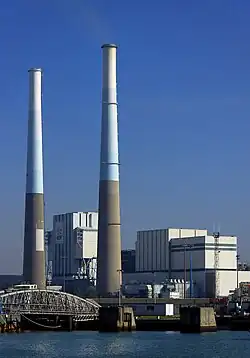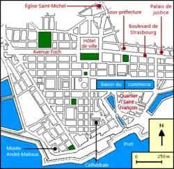 Le Havre belongs to the Paris Basin which was formed in the Mesozoic period. The Paris Basin consists of sedimentary rocks. The commune of Le Havre consists of two areas separated by a natural cliff edge: one part in the lower part of the town to the south including the harbour, the city centre and the suburbs. It was built on former marshland and mudflats that were drained in the 16th century.[26] The soil consists of several metres of alluvium or silt deposited by the Seine.[26] The city centre was rebuilt after the Second World War using a metre of flattened rubble as a foundation.[27][28]