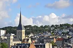 The upper town to the north, is part of the cauchois plateau: the neighbourhood of Dollemard is its highest point (between 90 and 115 metres (295 and 377 feet) above sea level). The plateau is covered with a layer of flinty clay and a fertile silt.[29] The bedrock consists of a large thickness of chalk measuring up to 200 m (656 ft) deep.[30] Because of the slope the coast is affected by the risk of landslides.[31]