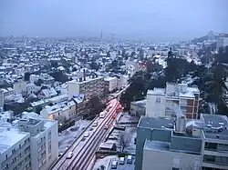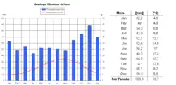 Precipitation is distributed throughout the year, with a maximum in autumn and winter. The months of June and July are marked by some thunderstorms on average 2 days per month.[32] One of the characteristics of the region is the high variability of the temperature, even during the day.[33] The prevailing winds are from the southwest sector for strong winds and north-north-east for breezes,[34] snowstorms occur in winter, especially in January and February.[32]