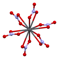 The crystal structure of solid lead(II) nitrate has been determined by neutron diffraction.[15][16] The compound crystallizes in the cubic system with the lead atoms in a face-centred cubic system. Its space group is Pa3Z=4 (Bravais lattice notation), with each side of the cube with length 784 picometres (7.84 Å).