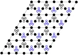 The black dots represent the lead atoms, the white dots the nitrate groups 27 picometres (0.27 Å) above the plane of the lead atoms, and the blue dots the nitrate groups the same distance below this plane. In this configuration, every lead atom is bonded to twelve oxygen atoms (bond length: 281 picometres (2.81 Å)). All N−O bond lengths are identical, at 127 picometres (1.27 Å).[17]
