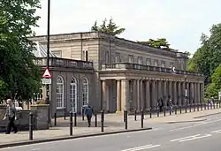 The old village of Leamington Priors was on the southern bank of the River Leam, and early development was based around this. During the early 19th century, developers began concentrating the town's expansion on the land north of the river. This resulted in the Georgian centre of New Town with the Leam flowing between the two.[11] By 1810, the town's existing bath houses could not cope with the increasing visitor numbers, and a syndicate was formed to build a new bath house north of the River Leam. A new saline spring was found on land close to the river, belonging to Bertie Greatheed, a wealthy plantation owner and landowner from Guy's Cliffe, and a member of the syndicate.[12] In 1814, the Royal Pump Rooms and Baths were opened on the site, designed by C.S. Smith, who also designed The Regent Hotel and the Upper Assembly Rooms in the town. Spa water can still be sampled outside the building.