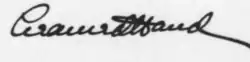 After reaching the age of 30 without developing a serious interest in a woman, Hand thought he was destined for bachelorhood. But, during a 1901 summer holiday in the Québec resort of La Malbaie, he met 25-year-old Frances Fincke, a graduate of Bryn Mawr College.[41] Though indecisive in most matters, he waited only a few weeks before proposing. The more cautious Fincke postponed her answer for almost a year, while Hand wrote to and occasionally saw her. He also began to look more seriously for work in New York City.[42] The next summer, both Hand and Fincke returned to La Malbaie, and at the end of August 1902, they became engaged and kissed for the first time.[43] They married on December 6, 1902, shortly after Hand had accepted a post with the Manhattan law firm of Zabriskie, Burrill & Murray.[44] The couple had three daughters: Mary Deshon (born 1905), Frances (born 1907), and Constance (born 1909). Hand proved an anxious husband and father. He corresponded regularly with his doctor brother-in-law about initial difficulties in conceiving and about his children's illnesses. He survived pneumonia in February 1905, taking months to recover.[45]