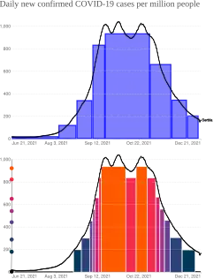 An equivalent way to introduce the Lebesgue integral is to use so-called simple functions, which generalize the step functions of Riemann integration. Consider, for example, determining the cumulative COVID-19 case count from a graph of smoothed cases each day (right).