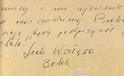 Wałęsa has offered conflicting statements regarding the authenticity of the documents.[110] Initially he appeared to come close to an admission, saying in 1992, "in December 1970, I signed three or four documents"[88][114] to escape from the secret police.[110] In his 1987 autobiography A Way of Hope,[115] Wałęsa said, "It is also the truth that I had not left that clash completely pure. They gave me a condition: sign! And then I signed."[88] He denied he acted upon the collaboration agreement.[116] However, in his later years Wałęsa said all the documents are forgeries and told the BBC in 2008, "you will not find any signature of mine agreeing to collaborate anywhere".[95][105]
