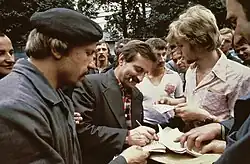 Wałęsa worked closely with the Workers' Defence Committee (KOR), a group that emerged to lend aid to people arrested after the 1976 labor strikes and to their families.[4] In June 1978, he became an activist of the underground Free Trade Unions of the Coast (Wolne Związki Zawodowe Wybrzeża).[14] On 14 August 1980, another rise in food prices led to a strike at the Lenin Shipyard in Gdańsk, of which Wałęsa was one of the instigators. Wałęsa climbed over the shipyard fence and quickly became one of the strike leaders.[4][12] The strike inspired other similar strikes in Gdańsk, which then spread across Poland. Wałęsa headed the Inter-Enterprise Strike Committee, coordinating the workers at Gdańsk and at 20 other plants in the region.[4] On 31 August, the government, represented by Mieczysław Jagielski, signed an accord (the Gdańsk Agreement) with the Strike Coordinating Committee.[4] Wałęsa used an oversized pen to sign the agreement, which was shown on television networks worldwide.[15] The agreement granted the Lenin Shipyard workers the right to strike and permitted them to form an independent trade union.[16] The Strike Coordinating Committee legalized itself as the National Coordinating Committee of the Solidarność (Solidarity) Free Trade Union, and Wałęsa was chosen as chairman of the committee.[4][14] The Solidarity trade union quickly grew, ultimately claiming over 10 million members—more than a quarter of Poland's population.[17] Wałęsa's role in the strike, in the negotiations, and in the newly formed independent trade union gained him fame on the international stage.[4][12]