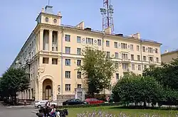 Though Oswald had wanted to attend Moscow State University, in January 1960 he was sent to Minsk, Byelorussia, to work as a lathe operator at the Gorizont Electronics Factory, which produced radios, televisions, and military and space electronics.[65] Stanislau Shushkevich, who later became independent Belarus's first head of state, also worked at Gorizont at the time, and was assigned to help Oswald improve his Russian.[66] Oswald received a government-subsidized, fully furnished studio apartment in a prestigious building and an additional supplement to his factory pay, which allowed him to have a comfortable standard of living by working-class Soviet standards,[67] though he was kept under constant surveillance.[68]