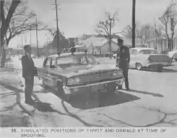 The Warren Commission concluded that at approximately 1:15 p.m., Dallas Patrolman J. D. Tippit drove up in his patrol car alongside Oswald, presumably because Oswald resembled the broadcast description of the man seen by witness Howard Brennan firing shots at Kennedy's motorcade. He encountered Oswald near the corner of East 10th Street and North Patton Avenue.[195][196] This location is about nine-tenths of a mile (1.4 km) southeast of Oswald's rooming house – a distance that the Warren Commission concluded "Oswald could have easily walked".[197] Tippit pulled alongside Oswald and "apparently exchanged words with [him] through the right front or vent window".[198] "Shortly after 1:15 p.m.",[n 9] Tippit exited his car. Oswald immediately fired his pistol and killed the policeman with four shots.[198][199] Numerous witnesses heard the shots and saw Oswald flee the scene holding a revolver; nine positively identified him as the man who shot Tippit and fled.[200][n 10] Four cartridge cases found at the scene were identified by expert witnesses[201] before the Warren Commission and the House Select Committee as having been fired from the revolver later found in Oswald's possession, excluding all other weapons. The bullets taken from Tippit's body could not be positively identified as having been fired from Oswald's revolver, as the bullets were too extensively damaged to make conclusive assessments.[201][202]