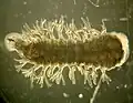 The most ancient annelid group consists of the free-living polychaetes that evolved in the Cambrian period, being plentiful in the Burgess Shale about 500 million years ago. Oligochaetes evolved from polychaetes and the leeches branched off from the oligochaetes.[16] Leech fossils are known from the middle Permian period around 266 million years ago,[17] there is also unpublished study about possible leech from Virgilian (Late Carboniferous) of New Mexico.[18] Although fossil with external ring markings found from Silurian strata in Wisconsin is sometimes identified as leech,[19][20] but assignment of fossil is still putative and contentious,[21][17] and the animal was also alternatively interpreted as a member of Cycloneuralia.[22][18] De Carle et al. (2025) identified a stem-leech specimen in the Silurian (Telychian) strata of the Brandon Bridge Formation in Wisconsin, designated as the holotype of the new taxon Macromyzon siluricus. De Carle et al. (2025) interpret the discovery of M. siluricus living in marine environment as suggesting that, rather than being descended from freshwater early clitellates, the earliest leeches were most likely ancestrally marine and subsequently transitioned to freshwater. As no crown vertebrates are known from the Waukesha Lagerstätte where M. siluricus was found, aside from agnathans like Panderodus, it likely fed on invertebrates as a predator or as a parasite.[23][24]