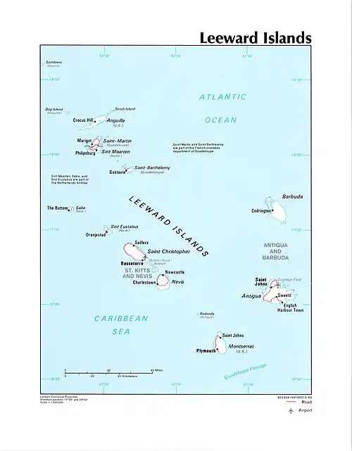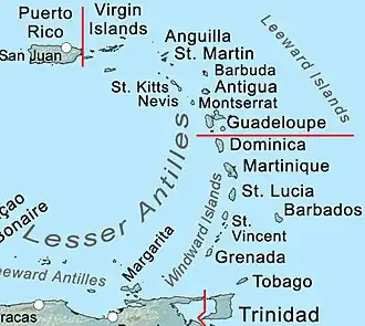 ![]() Map showing the Lesser Antilles; Leeward Islands (in the northeast) demarcated by red lines. | |