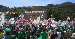 On 7 December, Salvini, endorsed by Maroni and most leading members (including Tosi, who had renounced a bid of his own), trounced Bossi with 82% of the vote in the "primary".[93] His election was ratified a week later by the party's federal congress in Turin.[94] Under Salvini, the party embraced a very critical view of the European Union,[95] especially of the euro, which he described a "crime against mankind".[96] Ahead of the 2014 European Parliament election, Salvini started to cooperate with Marine Le Pen, leader of the French National Front; and Geert Wilders, leader of the Dutch Party for Freedom.[97][98][99] All this was criticised by Bossi, who re-called his left-wing roots;[100][101] and Tosi, who represented the party's centrist wing and defended the Euro.[102]