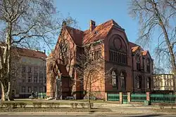 After the war, nonetheless, the city was developing rapidly. In 1258 at the church of St. Peter, a parish school was established, probably the first of its kind in Poland.[17] Around 1278 a Dominican monastery was founded by Bolesław II the Horned,[17] who was buried there as the only monarch of Poland to be buried in Legnica. Already by 1300 there was a city council in Legnica.[17] Duke Bolesław III the Generous granted new trade privileges in 1314 and 1318 and allowed the construction of a town hall, and in 1337 the first waterworks were built.[17] In the years 1327–1380 a new Gothic church of Saint Peter (today's Cathedral) was erected in place of the old one,[17] and is one of Legnica's landmarks since. Also by the 14th century the city walls were erected.[17] In 1345 the first coins were produced in the local mint.[17] In 1374, the potters' guild was founded, as one of the oldest in Silesia.[17] Queen consort of Poland Hedwig of Sagan died in Legnica in 1390 and was buried in the local collegiate church, which has not survived to this day.[18]