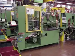 Since 1963, Lego pieces have been manufactured from ABS plastic.[19][42] As of September 2008, Lego engineers use the NX CAD/CAM/CAE PLM software suite to model the elements. The software allows the parts to be optimised by way of mould flow and stress analysis. Prototype moulds are sometimes built before the design is committed to mass production. The ABS plastic is heated to 232 °C (450 °F) until it reaches a dough-like consistency. It is then injected into the moulds using forces of between 25 and 150 tonnes and takes approximately 15 seconds to cool. The moulds are permitted a tolerance of up to twenty micrometres to ensure the bricks remain connected.[45] Human inspectors check the output of the moulds to eliminate significant variations in colour or thickness. According to the Lego Group, about eighteen bricks out of every million fail to meet the standard required.[50]