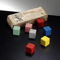 The Lego Group began in the workshop of Ole Kirk Christiansen (1891–1958), a carpenter from Billund, Denmark, who began making wooden toys in 1932.[7][8] In 1934, his company came to be called "Lego", derived from the Danish phrase leg godt [lɑjˀ ˈkʌt],[9][10] which means "play well".[11] In 1947, Lego expanded to begin producing plastic toys.[12] In 1949 the business began producing, among other new products, an early version of the now familiar interlocking bricks, calling them "Automatic Binding Bricks". These bricks were based on the Kiddicraft Self-Locking Bricks, invented by Hilary Page in 1939 and patented in the United Kingdom in 1940[13] before being displayed at the 1947 Earl's Court Toy Fair.[14] Lego had received a sample of the Kiddicraft bricks from the supplier of an injection-molding machine that it purchased.[15][16][17][18] The bricks, originally manufactured from cellulose acetate,[19] were a development of the traditional stackable wooden blocks of the time.[12]